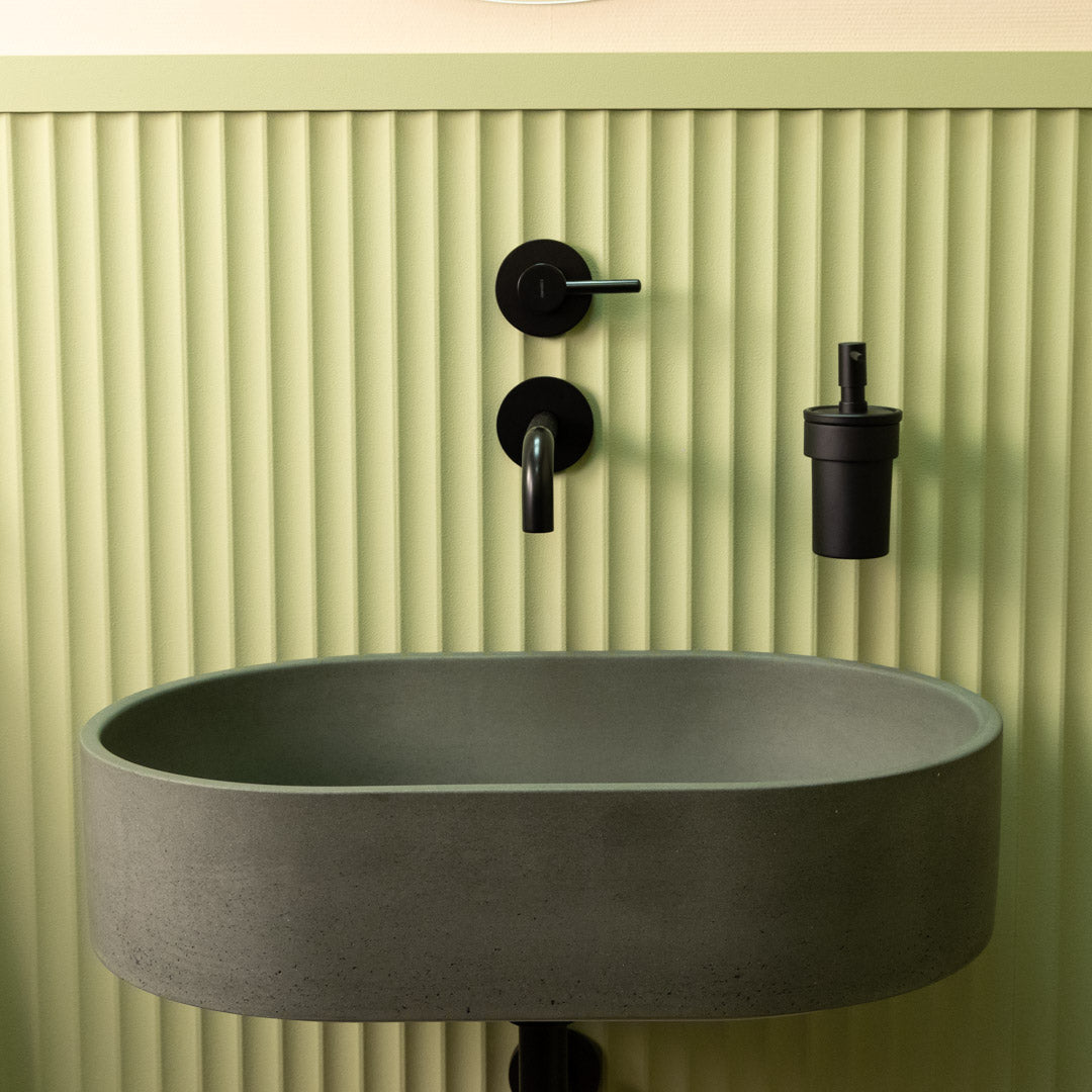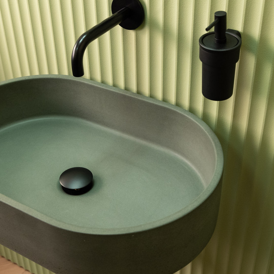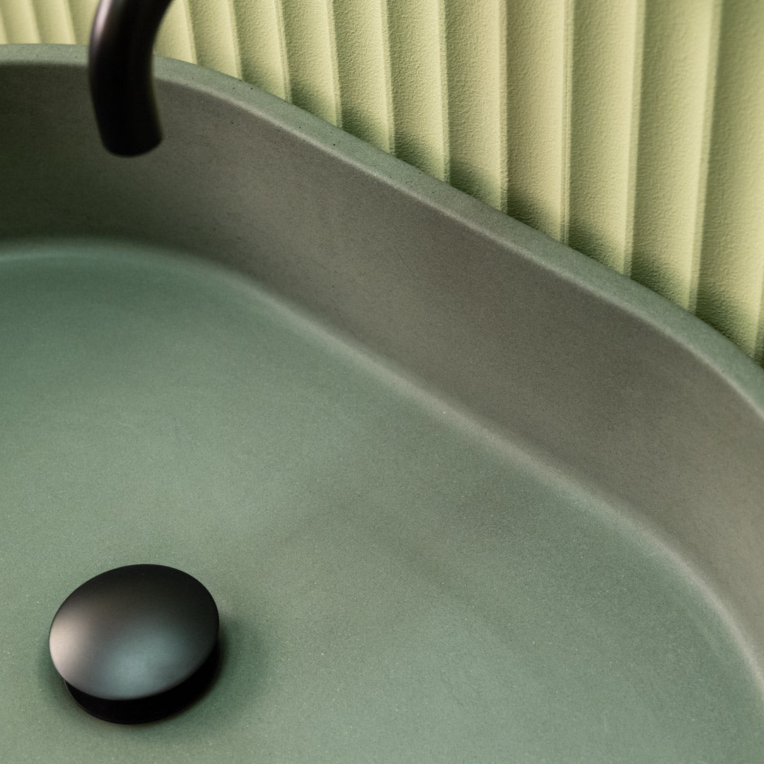 Handgefertigt aus hochleistungsfähigem GFRC (glasfaserverstärktem Beton) vereint dieses ovale Betonwaschbecken Langlebigkeit mit anspruchsvollem Design. Seine glatte, matte Oberfläche und organischen Kurven passen perfekt zu modernen und minimalistischen Innenräumen. Jedes Stück ist ein Unikat, mit subtilen Variationen in Farbton und Textur, die seinen handgefertigten Charakter widerspiegeln. Für eine einfache Montage auf der Arbeitsplatte konzipiert, ist es eine praktische und elegante Wahl für jedes Badezimmer.